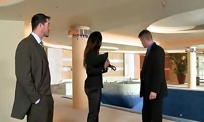 Red-hot secretary gets fucked by two cocks and receives a double flow on her face