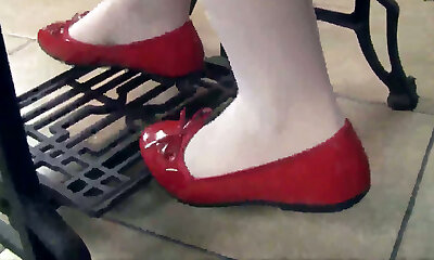 Pretty brunette lady Petra wears crimson flats while working with sewing machine