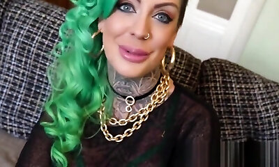 Busty inked and pierced SPH babe jerking small cock guy
