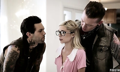 小金发在眼镜派珀Perri获取面部射液后的铁杆钢棒