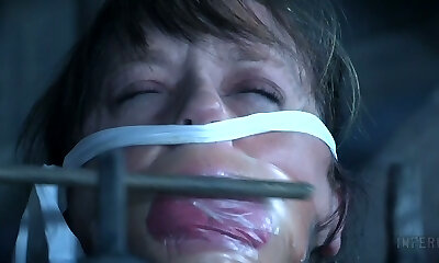 Skanky brunette doll gets her gullet plugged with gag in BDSM-sex clip